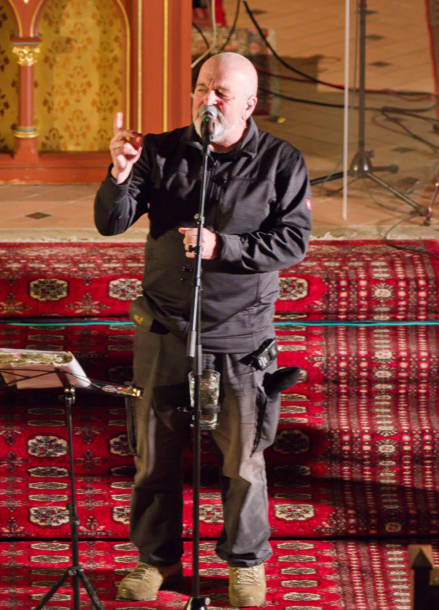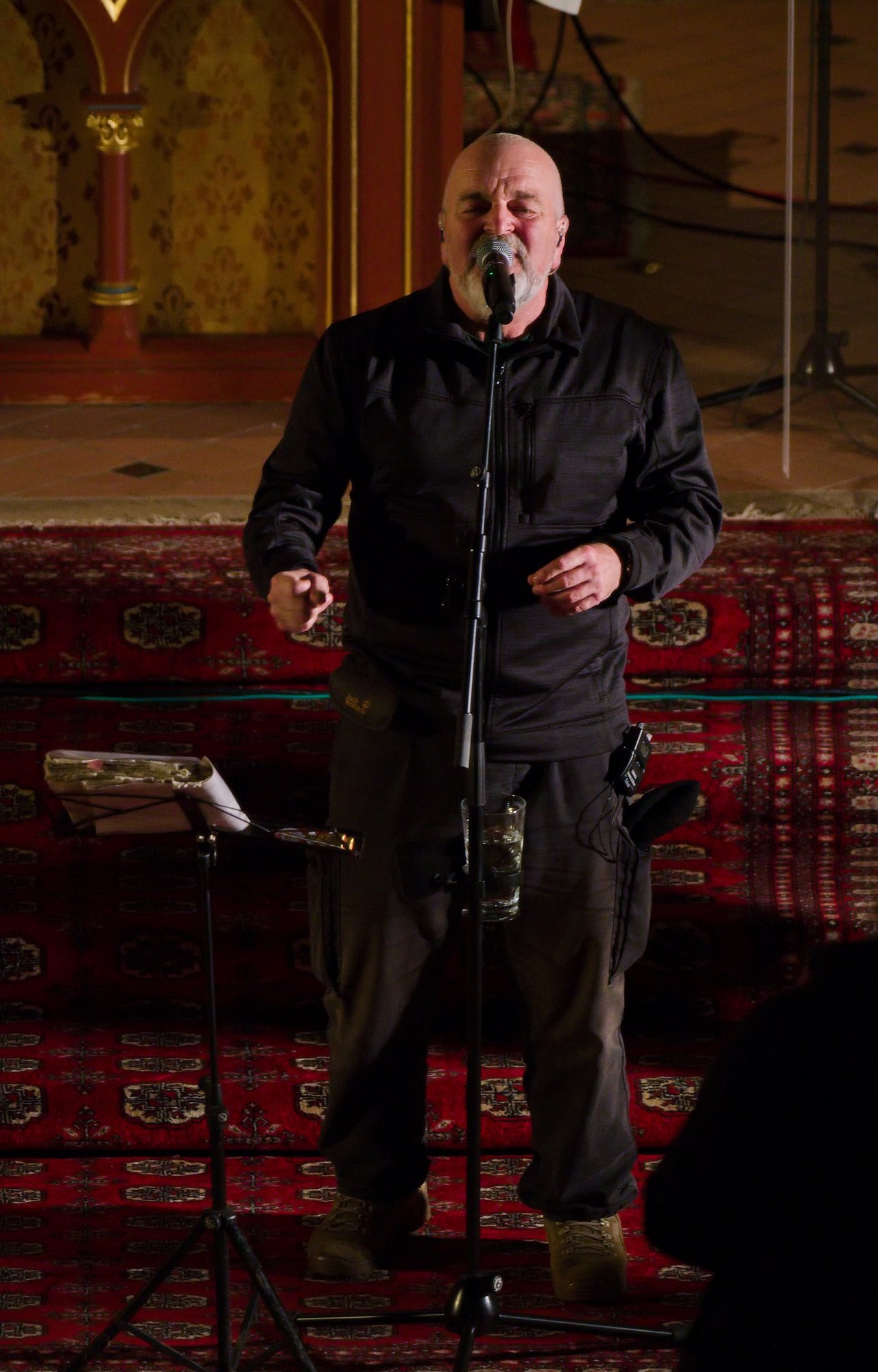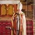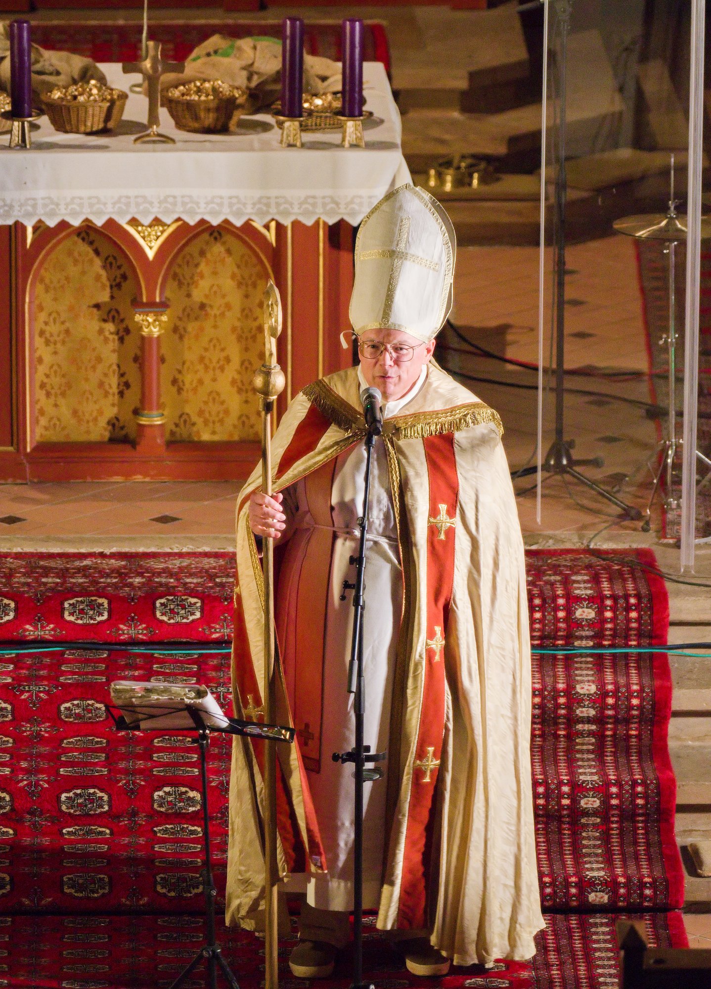 Mitten im Programm tauchte dann der Heilige auf, dessen Namenstag an diesem 6. Dezember gefeiert wurde. Unter dem Gewand und der Mitra, jedoch ohne Bart, war unschwer der Mann zu erkennen, den wir Sonntag für Sonntag am Altar sehen. Er erzählte aus dem Leben des Heiligen Nikolaus und wie dieser auch heute noch für uns Vorbild sein kann. Der achtjährige Tim aus Rüssingen bekam von der Band Mikrofon und Liedblatt und durfte zusammen mit Henry das Nikolauslied vorsingen, das mit vielen Mitsängerinnen und Sängern durch die Kirche hallte.