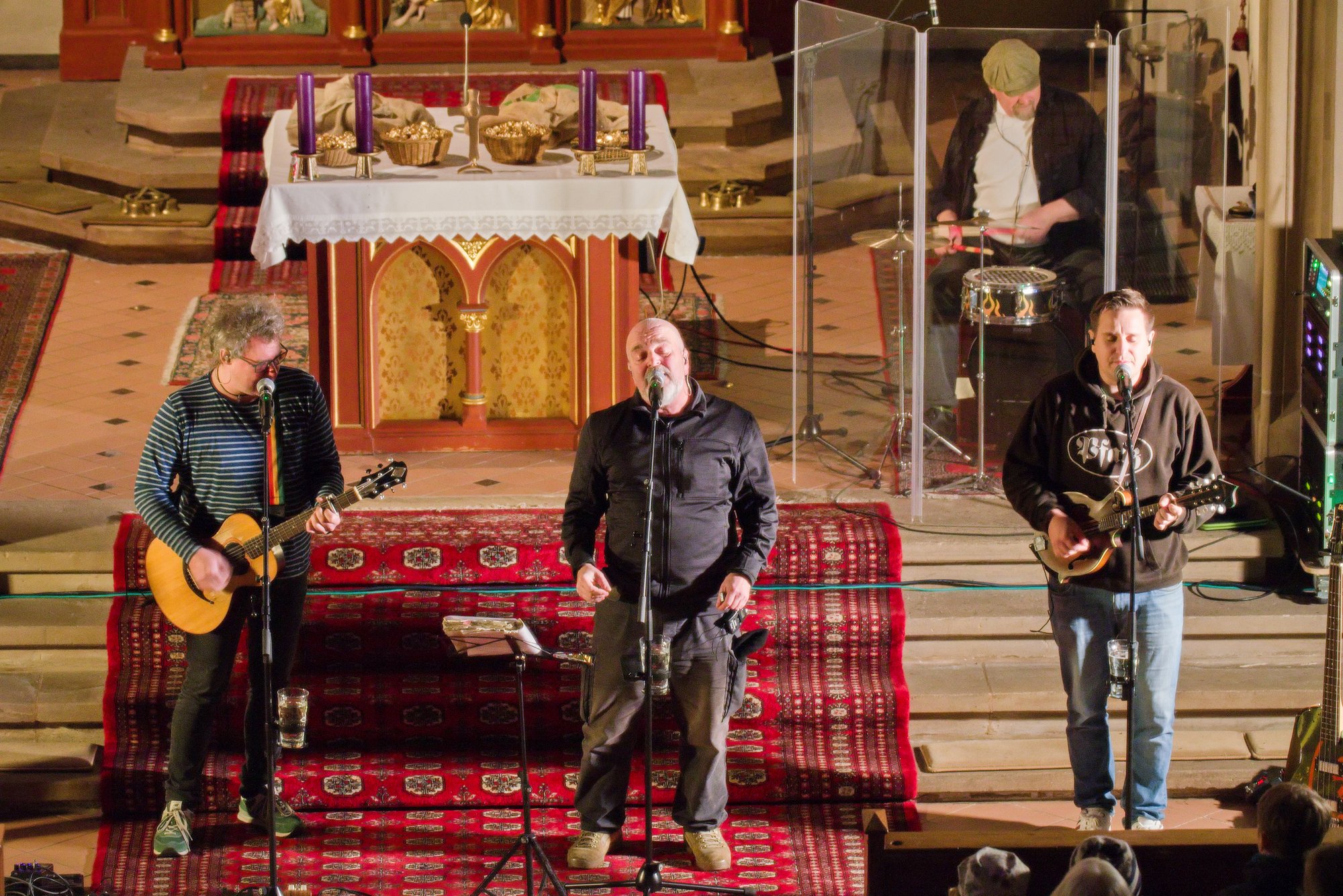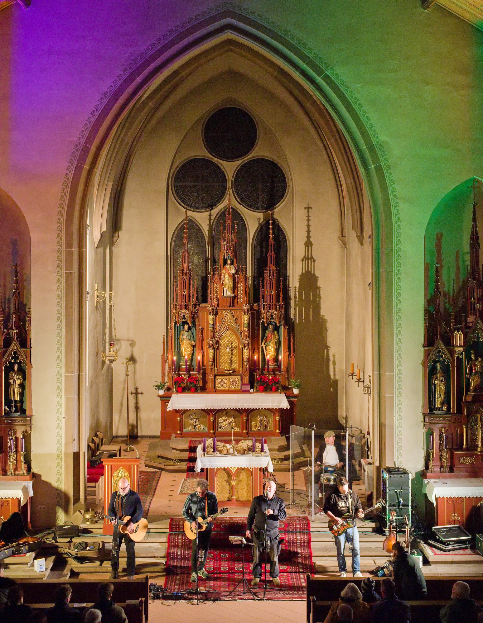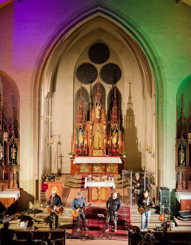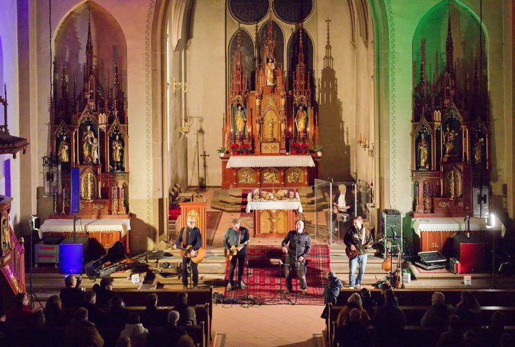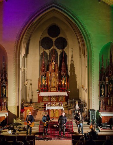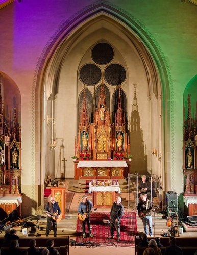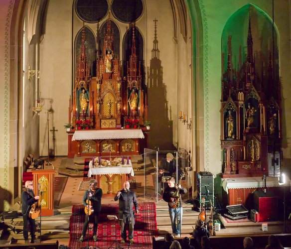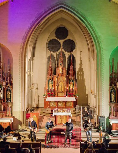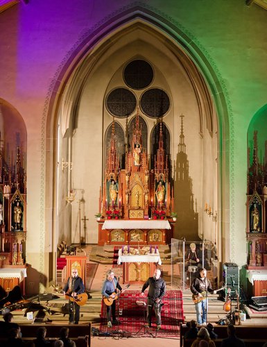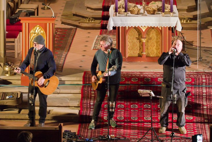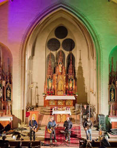 Gegen Ende dann ein packender und ergreifender Moment, Pfarrer Metzinger lud die Besucherinnen und Besucher ein, aufzustehen und über den Mittelgang hinaus einander die Hand zu reichen bis hin zur Band und gemeinsam das Vater unser zu beten. Den Segen und den Friedenswunsch durften später alle mit nach Hause nehmen. Reichlicher Applaus verabschiedete die Band, der es an diesem Abend gelungen ist, mit ihren Liedern scheinbar Profanes zum Gebet werden zu lassen.