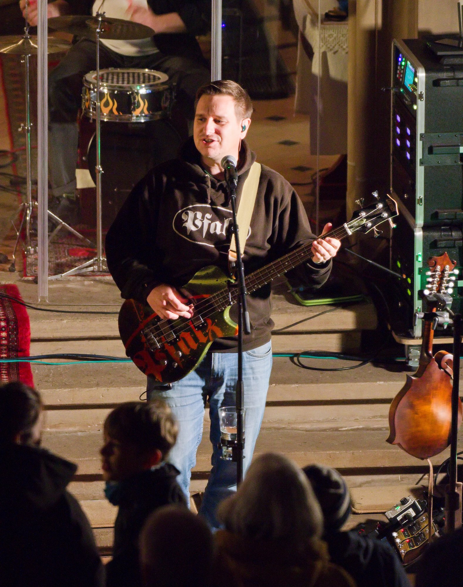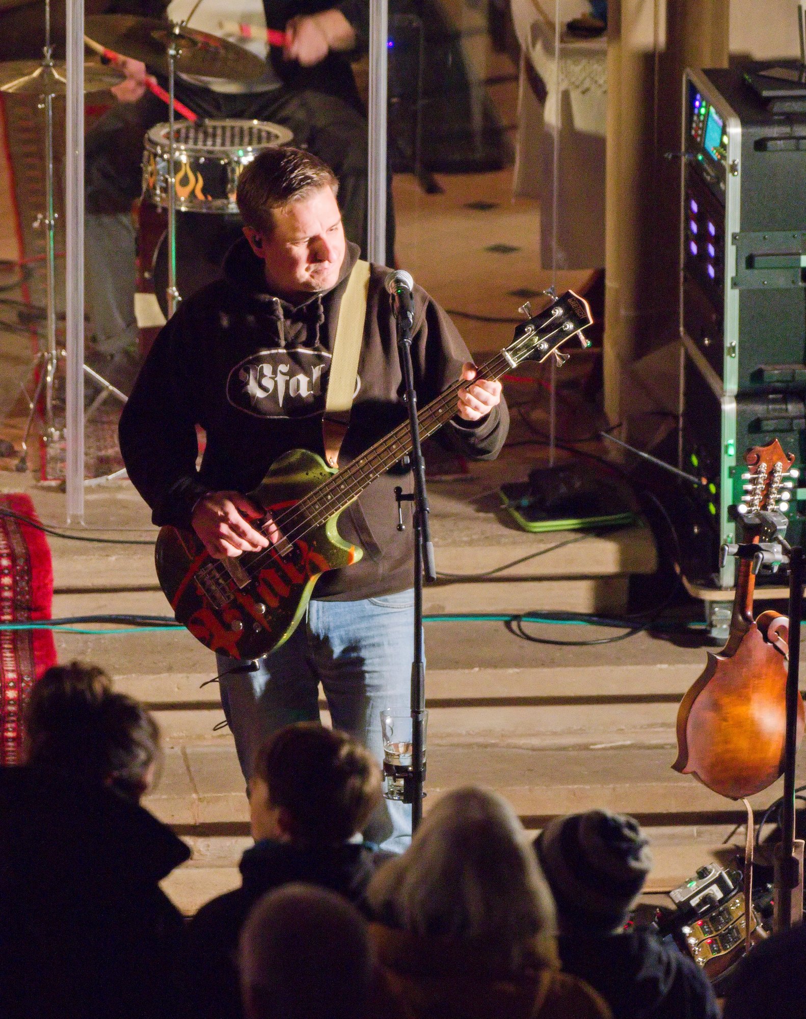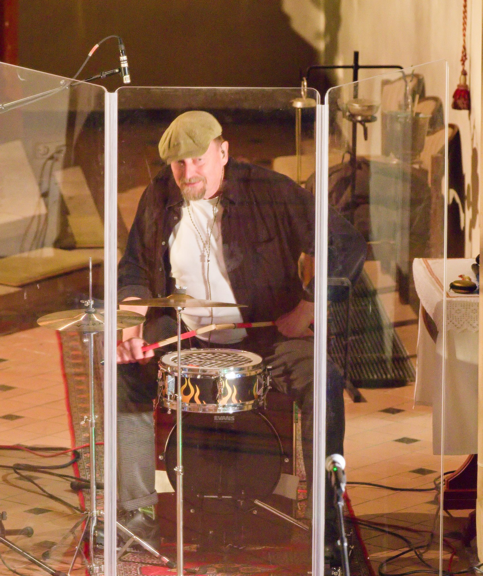Gegen Ende dann ein packender und ergreifender Moment, Pfarrer Metzinger lud die Besucherinnen und Besucher ein, aufzustehen und über den Mittelgang hinaus einander die Hand zu reichen bis hin zur Band und gemeinsam das Vater unser zu beten. Den Segen und den Friedenswunsch durften später alle mit nach Hause nehmen. Reichlicher Applaus verabschiedete die Band, der es an diesem Abend gelungen ist, mit ihren Liedern scheinbar Profanes zum Gebet werden zu lassen.