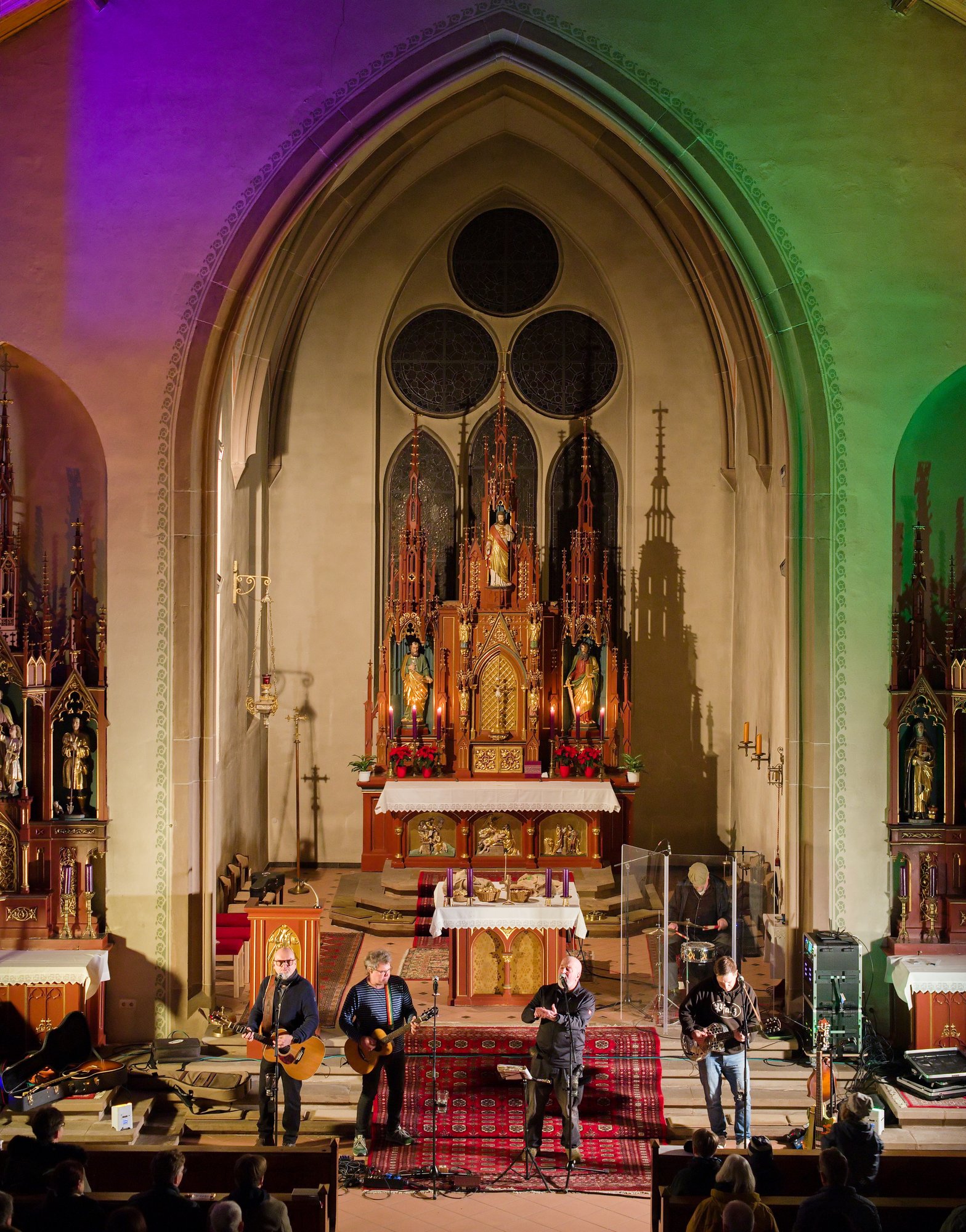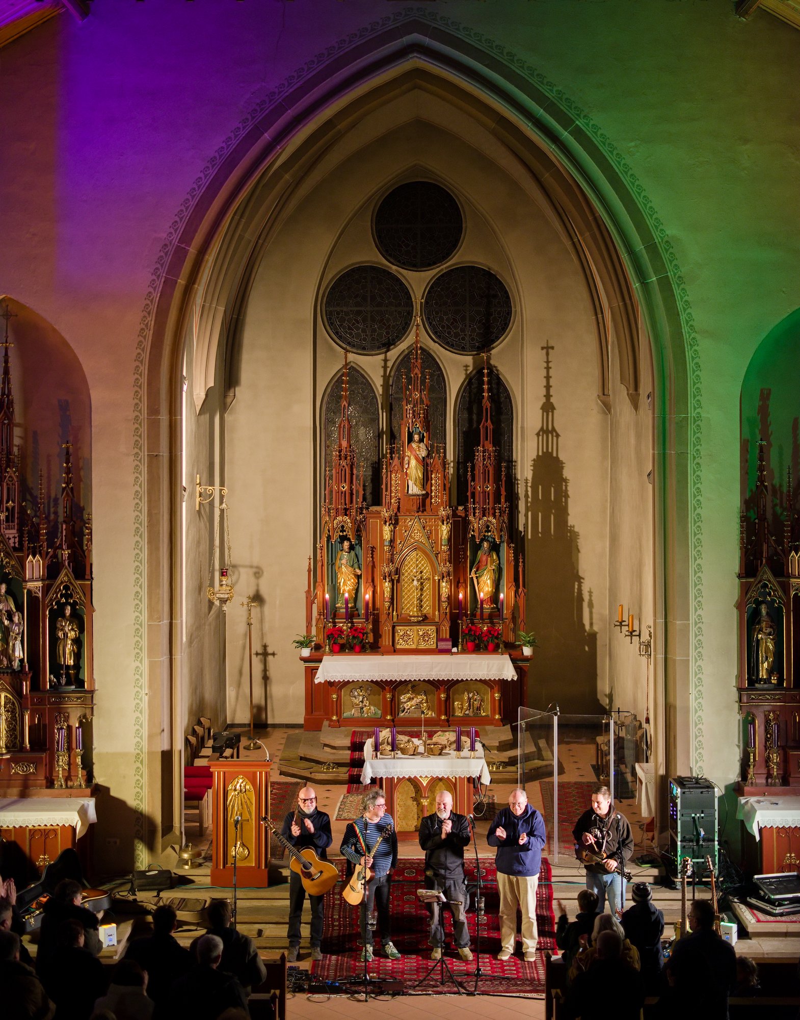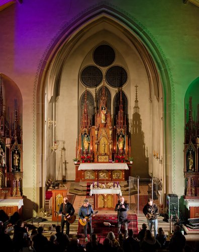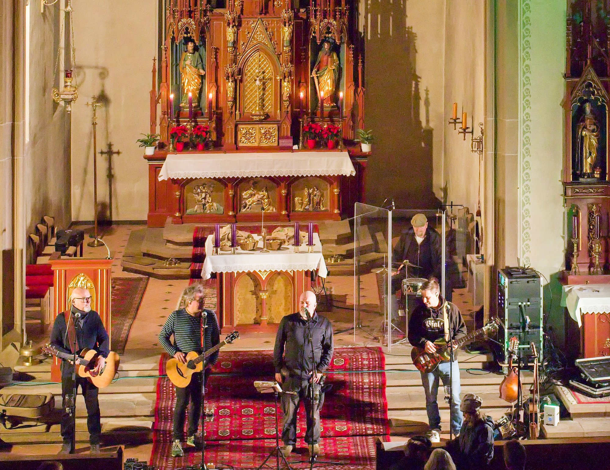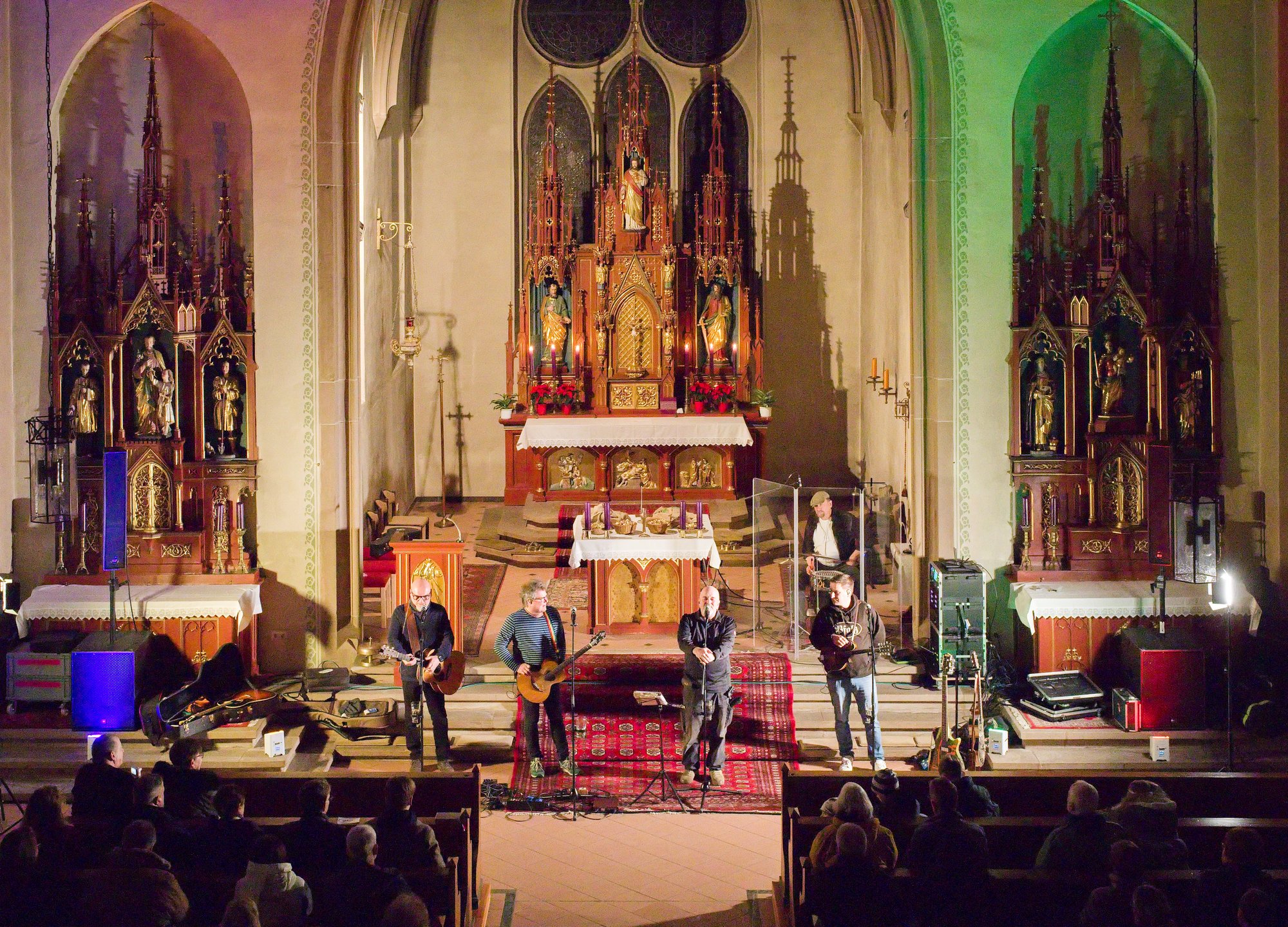 Am Nikolaustag 2025 war in der katholischen Kirche St. Amandus in Ottersheim Konzert mit der 1995 in Frankenthal gegründeten Band die „Anonyme Giddarischde“ angesagt. Die Kirche fühlte sich an diesem Abend verkabelt an, behielt aber trotzdem ihre besinnliche Ausstrahlung. Wie kamen diese Musiker und Mundartsänger in die Kirche und aufs Programm? Ganz einfach, „wenn man de Leit uffs Maul guckt“ oder ihnen die Gelegenheit gibt, einmal zu sagen, was sie denken und wünschen. So geschehen war es auf einer Pfarrversammlung für die Gläubigen der Kirchengemeinde Ottersheim am 20. Februar 2024. Da wurde der Wunsch geäußert, in der Ottersheimer Kirche auch Konzertgottesdienste anzubieten. Durch ein Weitersweilerer Pfarreiratsmitglied kam es zum Kontakt mit der pfalzweitbekannten Kultband. Die hatten jedoch bisher noch nie in einer katholischen Kirche gespielt und konnten sich eigentlich nicht vorstellen, dass sie überhaupt jemand in der Kirche will. Die Band sagte zu und es war ihre Freude zu spüren, als sie sich vor den Altarstufen aufstellten und nach der Begrüßung durch Pfarrer Metzinger mit ihrem Programm begannen. Aus dem Konzert wurde ein Konzertgottesdienst und die Lieder, die auf Kerweplätzen vielleicht oft gegrölt werden, hörten sich in den Ohren der Zuhörer*innen wie tiefgehende Texte mit christlichen Werten an. In den Gesprächen nach dem Konzert wurde das deutlich wohlwollend geäußert. Lieder der Band in Mundart, so richtig pfälzisch gesungen verehrten die Heimat, das Zusammenleben der Menschen auf dem Land, huldigten der schönen Natur und Schöpfung, dem Pfälzerwald und feierten musikalisch menschliche Beziehungen, um natürlich auch der Lewwerworscht die Ehre zu erweisen, es war geradezu ein Hoch auf das tägliche Brot, das uns der himmlische Vater schenkt. Die Pfalz steht bei ihnen hoch in Ehren und wird als besondere Heimat geliebt. Thomas „Edsel“ Merz, der Songtexter und Sänger, moderierte die Lieder und entlockte seiner Mundharmonika zarte Töne. Er fand in Sprache und Wortwahl, was gut zum Advent passte.