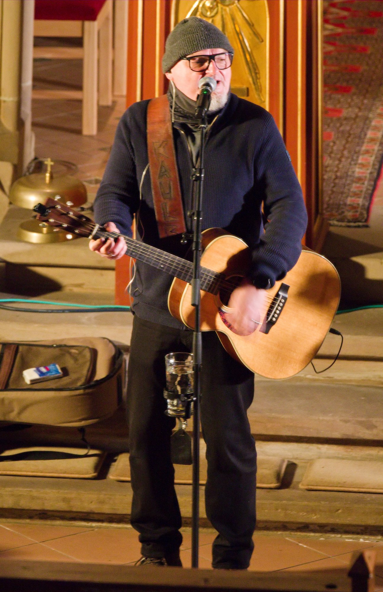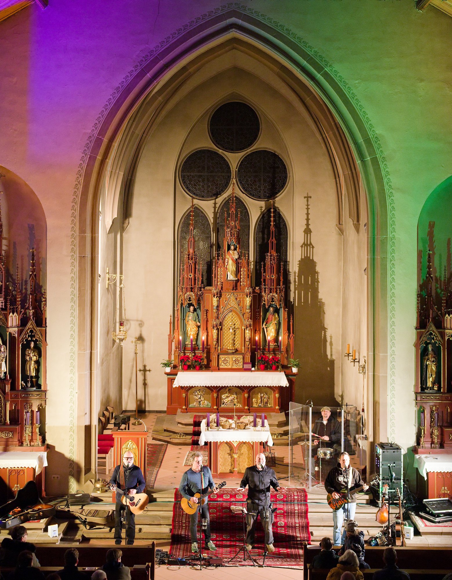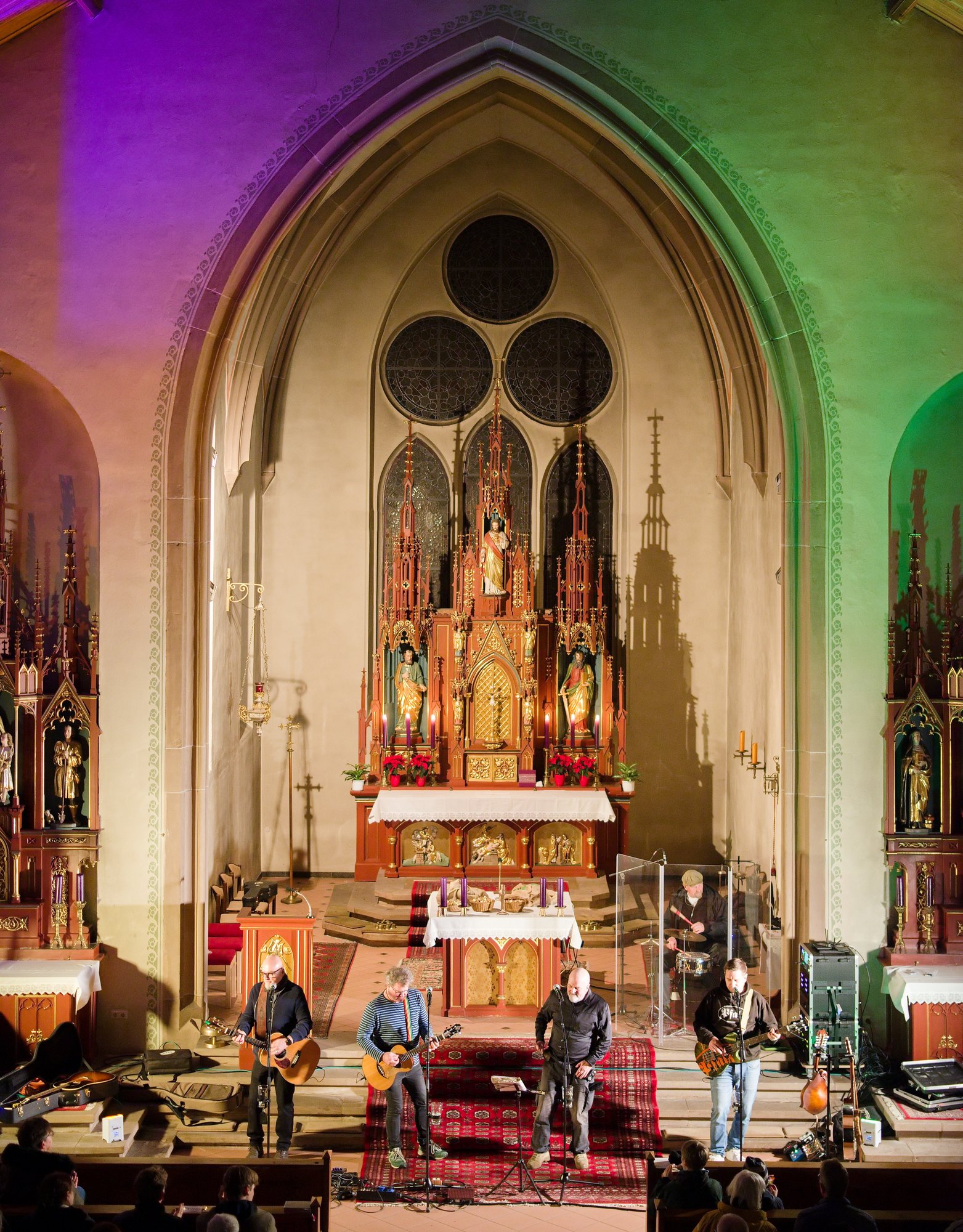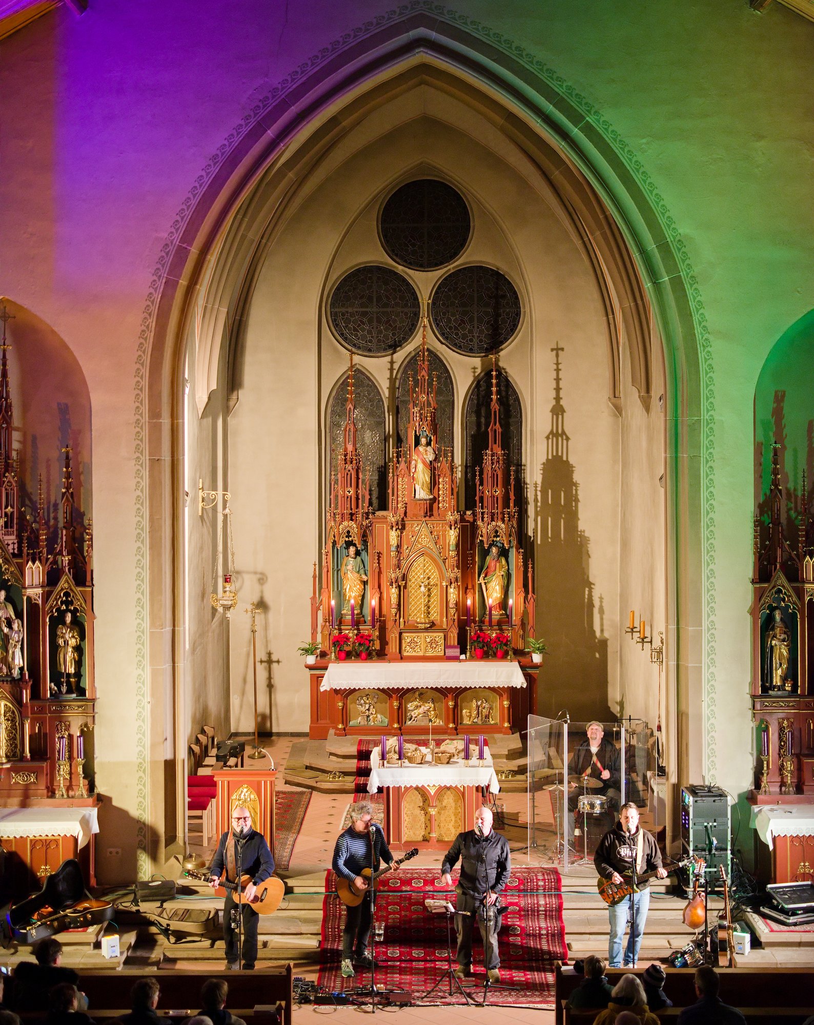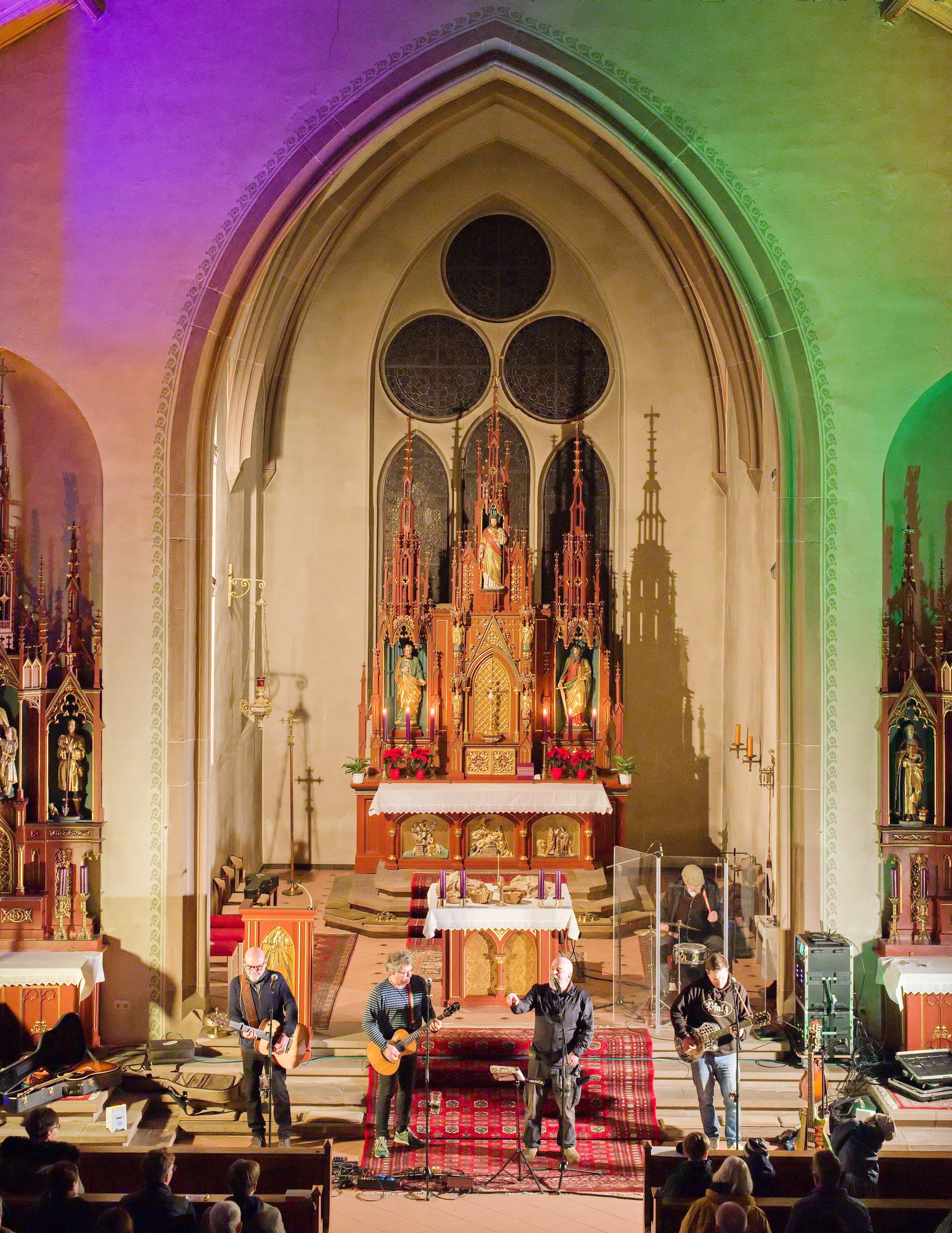 Am Nikolaustag 2025 war in der katholischen Kirche St. Amandus in Ottersheim Konzert mit der 1995 in Frankenthal gegründeten Band die „Anonyme Giddarischde“ angesagt. Die Kirche fühlte sich an diesem Abend verkabelt an, behielt aber trotzdem ihre besinnliche Ausstrahlung. Wie kamen diese Musiker und Mundartsänger in die Kirche und aufs Programm? Ganz einfach, „wenn man de Leit uffs Maul guckt“ oder ihnen die Gelegenheit gibt, einmal zu sagen, was sie denken und wünschen. So geschehen war es auf einer Pfarrversammlung für die Gläubigen der Kirchengemeinde Ottersheim am 20. Februar 2024. Da wurde der Wunsch geäußert, in der Ottersheimer Kirche auch Konzertgottesdienste anzubieten. Durch ein Weitersweilerer Pfarreiratsmitglied kam es zum Kontakt mit der pfalzweitbekannten Kultband. Die hatten jedoch bisher noch nie in einer katholischen Kirche gespielt und konnten sich eigentlich nicht vorstellen, dass sie überhaupt jemand in der Kirche will. Die Band sagte zu und es war ihre Freude zu spüren, als sie sich vor den Altarstufen aufstellten und nach der Begrüßung durch Pfarrer Metzinger mit ihrem Programm begannen. Aus dem Konzert wurde ein Konzertgottesdienst und die Lieder, die auf Kerweplätzen vielleicht oft gegrölt werden, hörten sich in den Ohren der Zuhörer*innen wie tiefgehende Texte mit christlichen Werten an. In den Gesprächen nach dem Konzert wurde das deutlich wohlwollend geäußert. Lieder der Band in Mundart, so richtig pfälzisch gesungen verehrten die Heimat, das Zusammenleben der Menschen auf dem Land, huldigten der schönen Natur und Schöpfung, dem Pfälzerwald und feierten musikalisch menschliche Beziehungen, um natürlich auch der Lewwerworscht die Ehre zu erweisen, es war geradezu ein Hoch auf das tägliche Brot, das uns der himmlische Vater schenkt. Die Pfalz steht bei ihnen hoch in Ehren und wird als besondere Heimat geliebt. Thomas „Edsel“ Merz, der Songtexter und Sänger, moderierte die Lieder und entlockte seiner Mundharmonika zarte Töne. Er fand in Sprache und Wortwahl, was gut zum Advent passte.