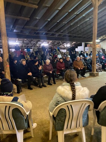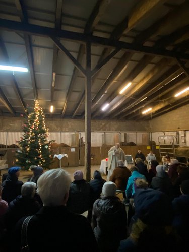 Der Friedensgruß, ausgehend vom Altar, erreichte über Strohballen hinweg alle Gäste. Pfarrer Metzinger freute sich sichtlich über den guten Besuch und dankte der Gutsfamilie, die viel dafür getan hatte, dass alle gesegnet in die nächsten Tage gehen konnten. Nach dem Gottesdienst gab es an der Theke Punsch und Glühwein, damit nicht nur die Herzen erwärmt waren, sondern auch Hände und Füße.