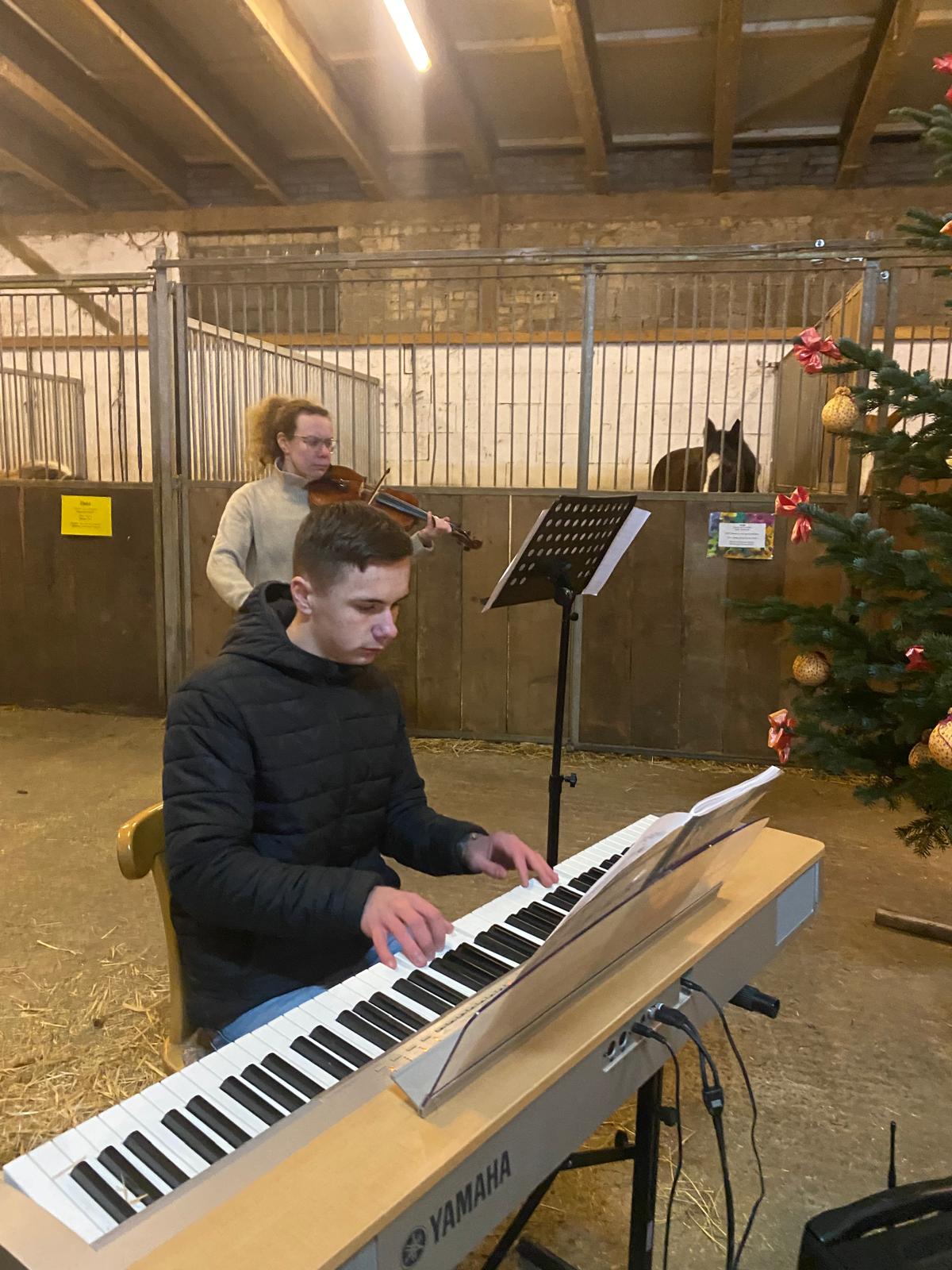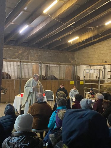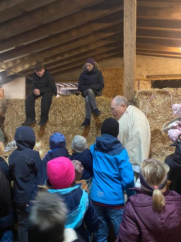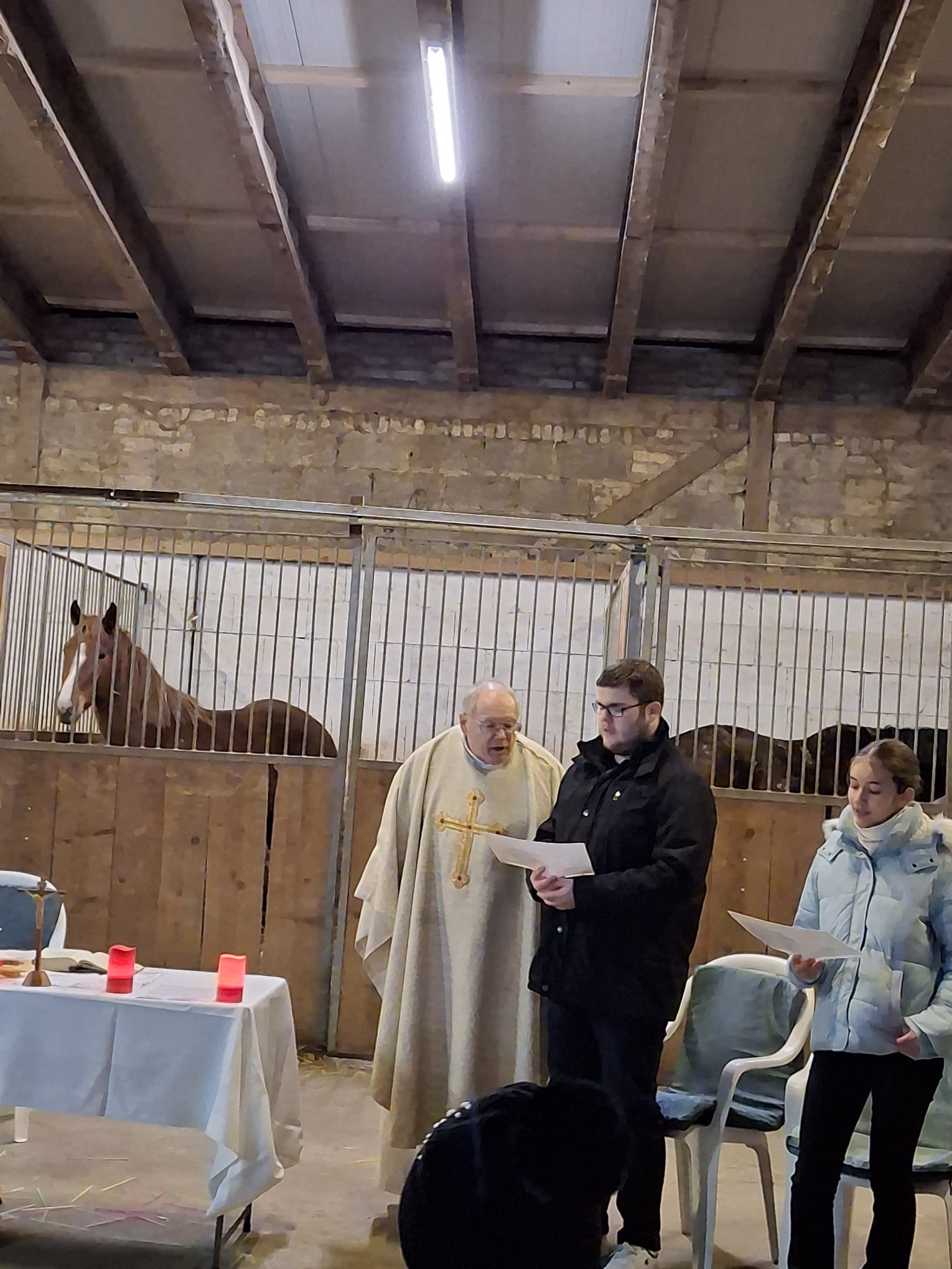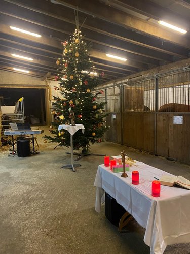 Lautersheim am ersten Weihnachtsfeiertag um 18 Uhr: Die Stalltür auf dem Gutshof war geöffnet und etwa 160 „weihnachtssuchende“ Kinder, Frauen und Männer strömten herbei. Der Stall war von Familie Günther stimmungs- und mühevoll hergerichtet. Ein großer Weihnachtsbaum leuchtete für den Festgottesdienst „Weihnachten im Stall“. Vorhanden waren viele Sitzgelegenheiten, die erste Klasse befand sich auf Strohballen. Viele Pferde schauten aus ihren Boxen auf das Geschehen, schnaubten und fühlten sich sichtlich wohl. Manchmal schien es so, als stärkten sie Pfarrer Josef Metzinger für die Messfeier den Rücken. Die musikalischen Beiträge der Familie, Papa Volker mit der Trompete, Tochter Ricarda und Enkelin Ada mit den Geigen und Sohn Severin am Klavier gaben der Feier einen besonderen und würdigen Klang. Mama Henny und Tochter Odilia trugen Lesung und Fürbitten vor.