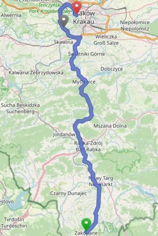 | 13:00 | Abfahrt nach Kraków | Distanz: 108 km • Fahrzeit: 4 h Nicht wundern, das hat Google so ausgerechnet und womöglich auch den Berufsverkehr bei Kraków berücksichtigt |