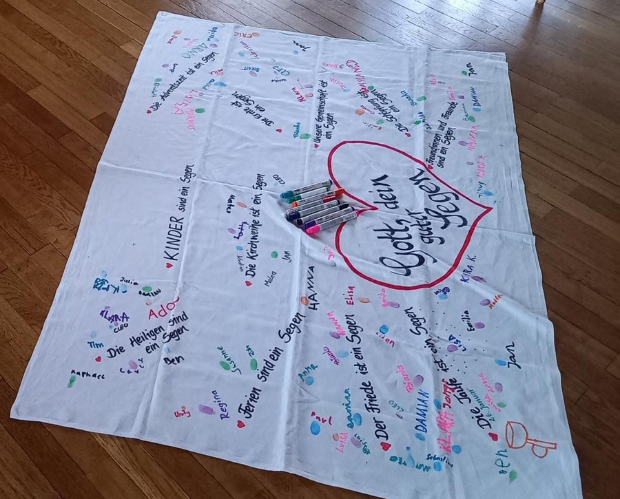 Zu diesen Themen wurde im Laufe des Jahres auch ein Segenstuch gestaltet, mit Fingerabdrücken und Namen der Kinder und von Erwachsenen. Das Segenstuch hat uns begleitet und wir werden von ihm einen Schal/ein Tuch drucken lassen für jedes teilnehmende Kind.