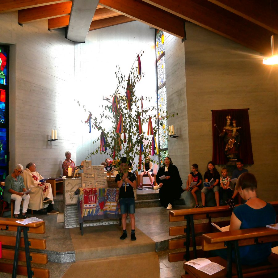 Am ersten Wochenende im September wird in „Rischinge die Kerb gefeiert“ und dazu gehört auch der ökumenische Gottesdienst mit dem gemeinsamen Abendmahl, dieses Jahr in der katholischen Kirche. Das Ökumeneteam: Sabine Jilek, Pfarrer Josef Metzinger, Arno Stuppy, Pfarrerin Lina Ehrmann und Birgit Baqué-Stuppy und vor allem die 9 mitwirkenden Kinder füllten den Chorraum der Kirche aus.